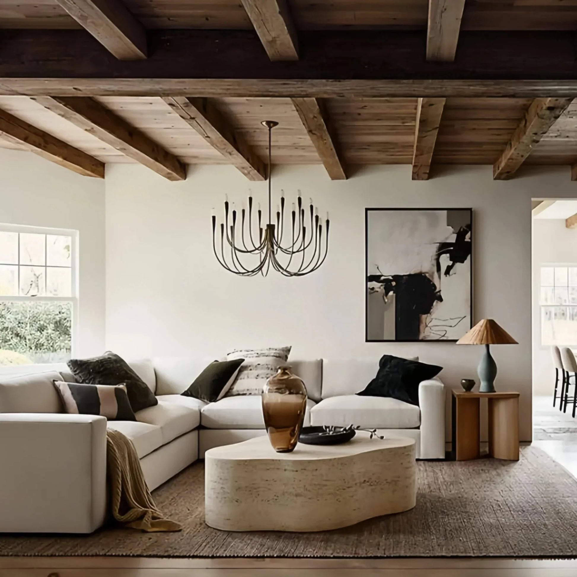 “Brushed brass arms extend in scattered arrangement, paired with marbled stone spheres (contrasting tones) and translucent white globes. Balancing minimalism and refined elegance, it’s ideal for sophisticated spaces.”