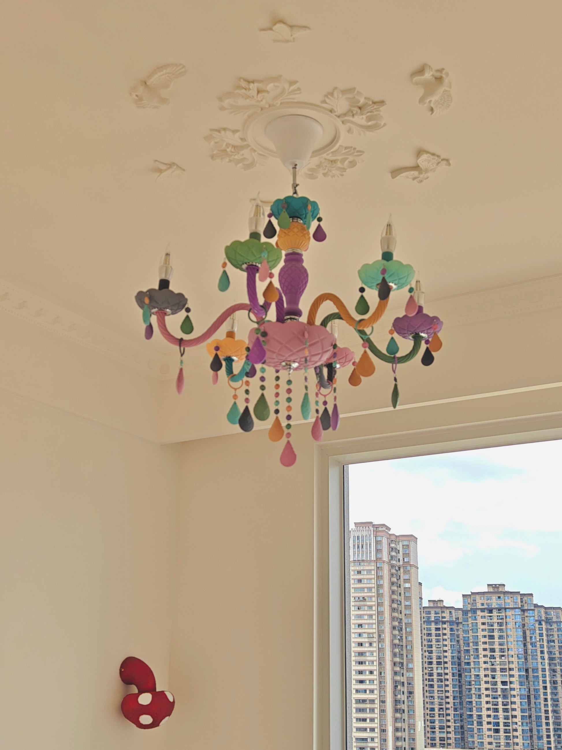 This chandelier is crafted in macaron-colored resin, with twisted arms and teardrop pendants. Its vibrant, healing hues and playful, dreamy design light up the space, infusing the room with full of girlish heart and fairy-tale atmosphere.