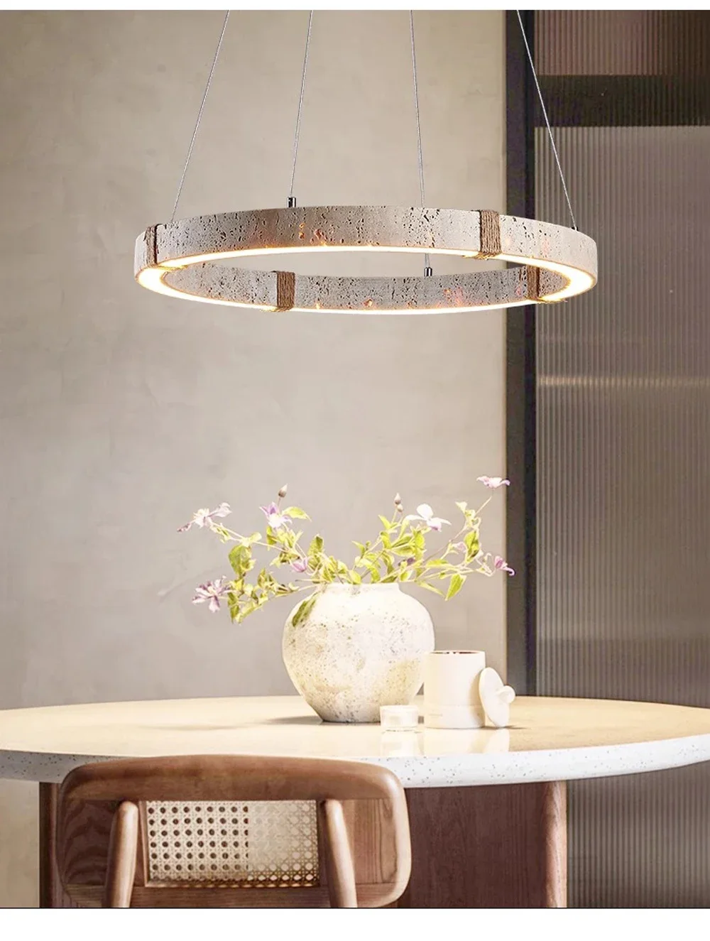 Natural Travertine Ring Pendant Light Wabi Sabi Stone Wood Chandelier for Kitchen Island Dining Living Room Ceiling Lighting Fixture