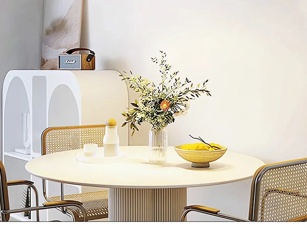 “This is a fresh kitchen with light beige cabinets and white tile walls, paired with a marble island. Two light green pumpkin-shaped chandeliers are the highlight—it’s neat, elegant, blending practicality and retro charm.”
