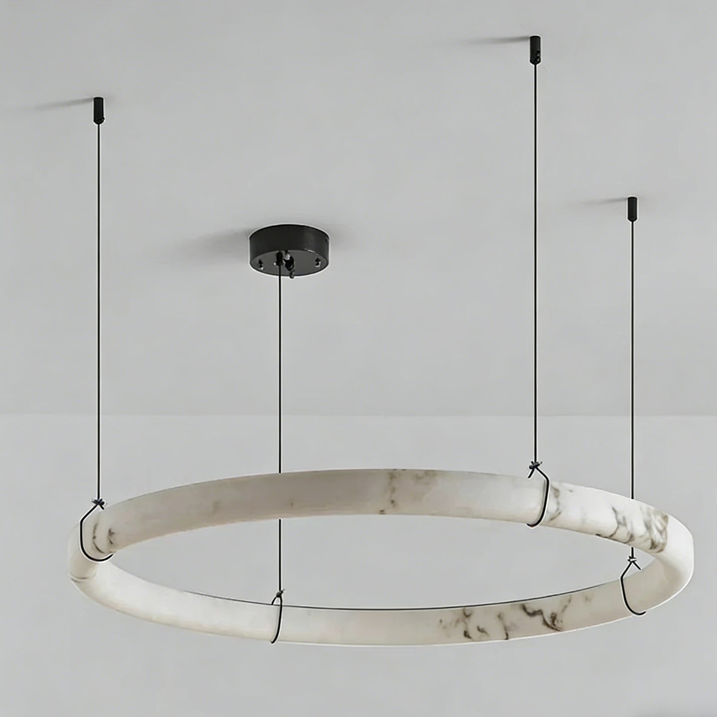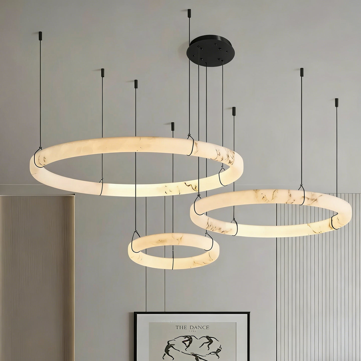 “Brushed brass arms extend in scattered arrangement, paired with marbled stone spheres (contrasting tones) and translucent white globes. Balancing minimalism and refined elegance, it’s ideal for sophisticated spaces.”