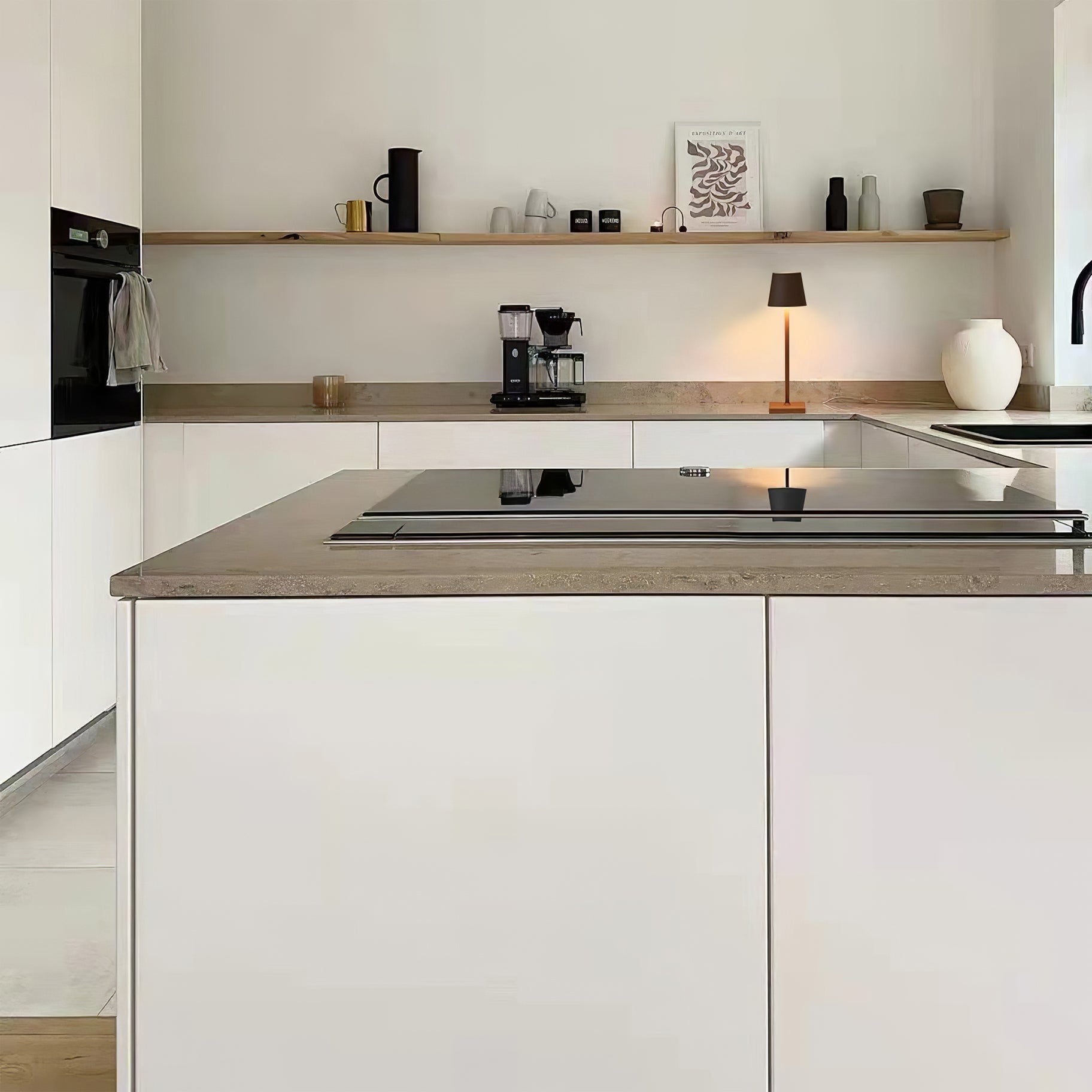 “This is a fresh kitchen with light beige cabinets and white tile walls, paired with a marble island. Two light green pumpkin-shaped chandeliers are the highlight—it’s neat, elegant, blending practicality and retro charm.”