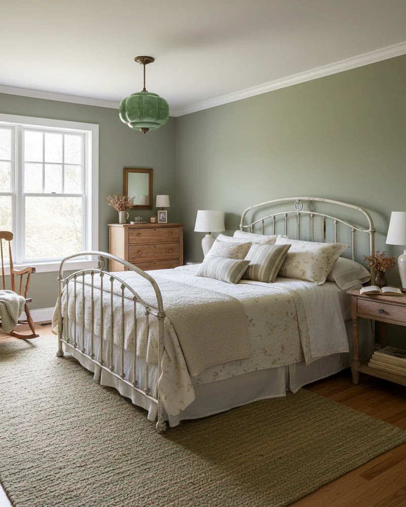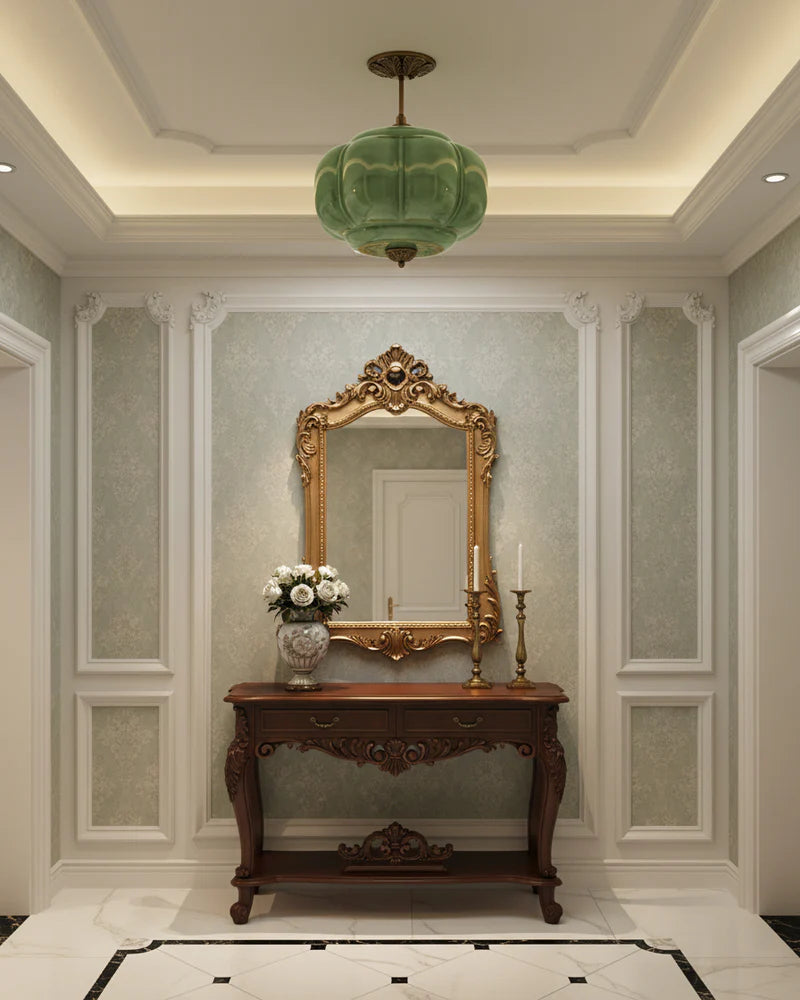 “This is a fresh kitchen with light beige cabinets and white tile walls, paired with a marble island. Two light green pumpkin-shaped chandeliers are the highlight—it’s neat, elegant, blending practicality and retro charm.”